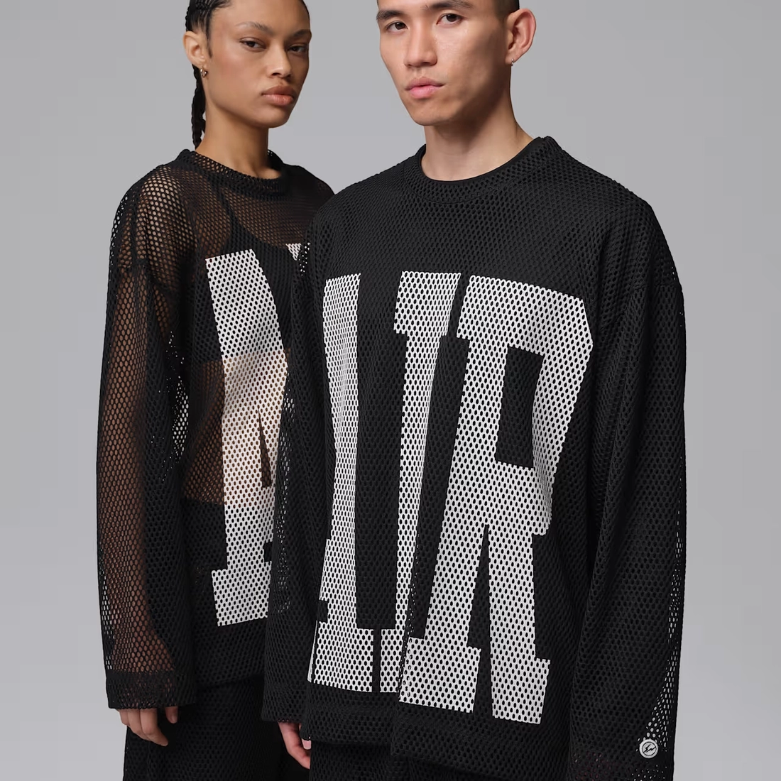 Fragment Design의 히로시와 Union Los Angeles의 크리스 깁스. 스트리트웨어의 두 거장이 가장 잘하는 방식대로 패션과 스포츠의 경계를 허물었습니다. 오버사이즈의 박시한 긴팔 티셔츠 핏을 성긴 메쉬 소재로 구현하고, 에어 조던을 상징하는 ‘Air’ 문구를 더해 디자인을 완성했습니다.<br>