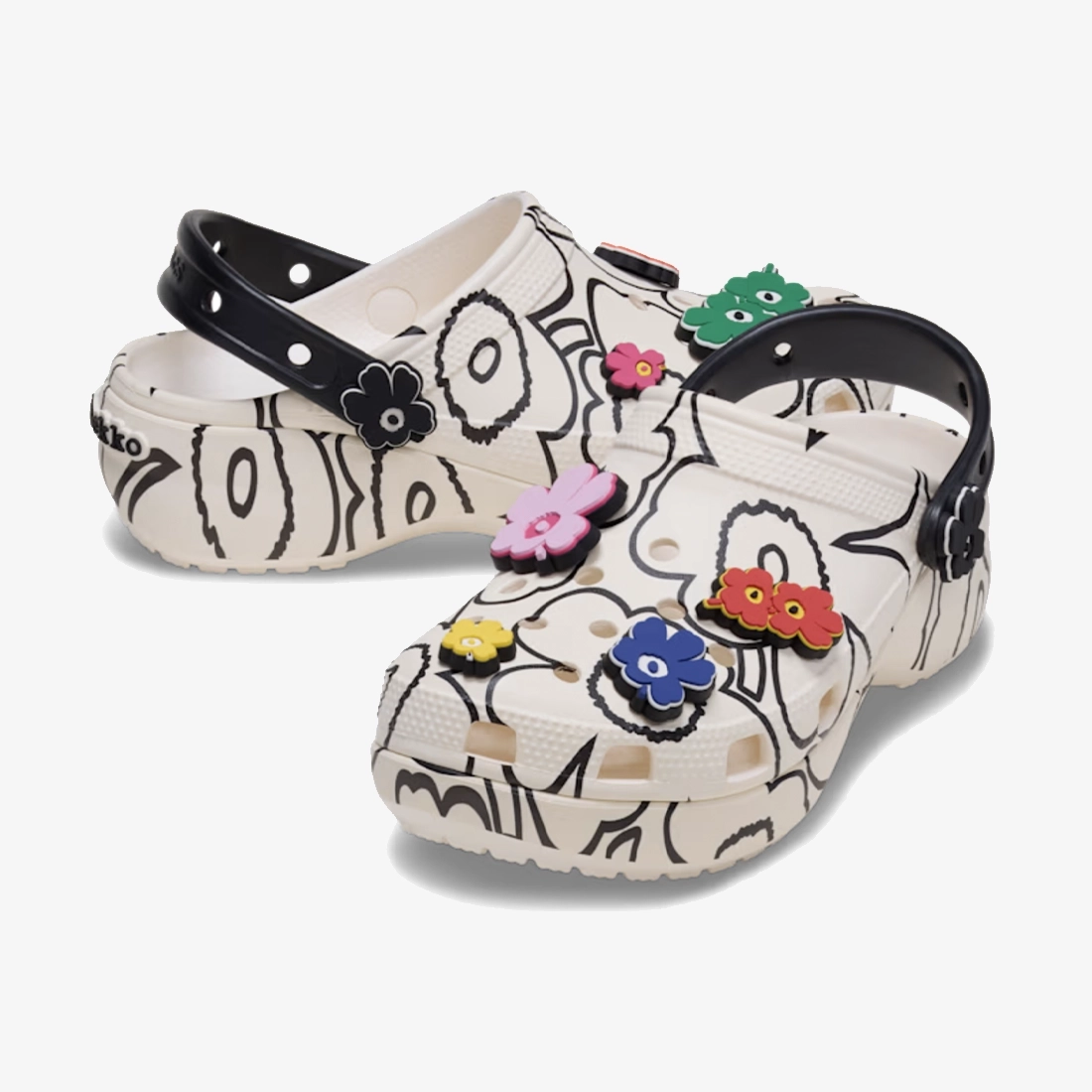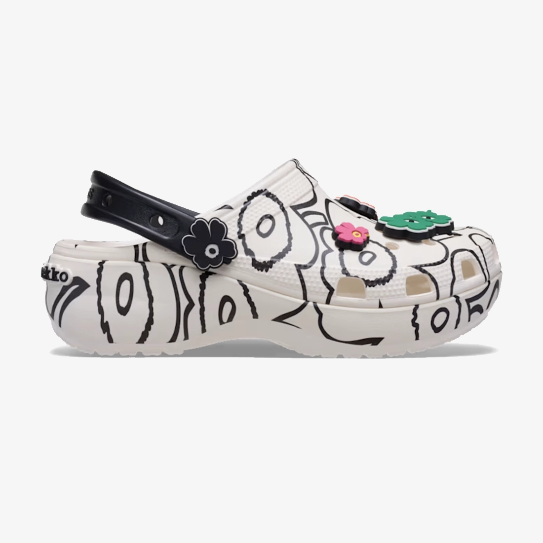 특별함이 가득한 마리메꼬 x 크록스 클래식 플랫폼 클로그는 1964년 마이야 이솔라가 창작한 우니꼬 프린트가 전체적으로 적용된 블랙 앤 화이트 컬러 조합을 자랑합니다. 한정판 지비츠™ 참들이 컬러를 더하고 나만의 스타일을 위한 충분한 공간이 마련되어 있습니다. 입체적인 우니꼬 플로럴 리벳과 발바닥에 새겨진 마리메꼬 로고가 이 트렌디한 플랫폼 스타일에 브랜드의 전통을 더합니다.